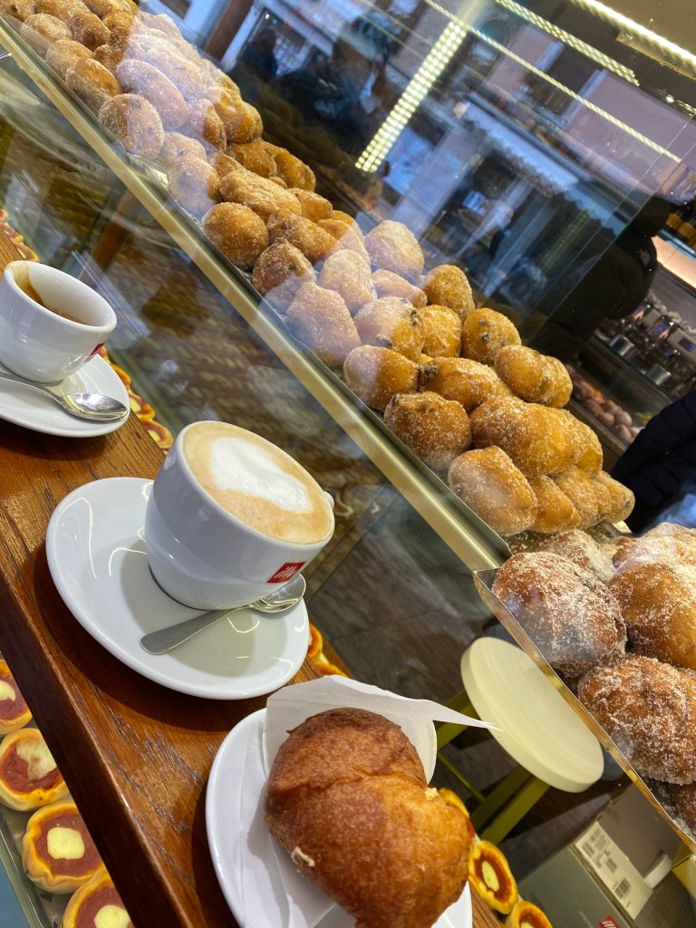 The city is currently celebrating Carnevale – an annual festival that lasts about two weeks and ends on the Tuesday before Lent. The festival is famous for its costumes, masks, and special sweets, like frittelle (pictured above on the left), special filled doughnuts served only during the Carnevale season. The city was decorated beautifully and there was colorful confetti covering the ground and people dressed up in traditional Venetian Carnevale costumes.