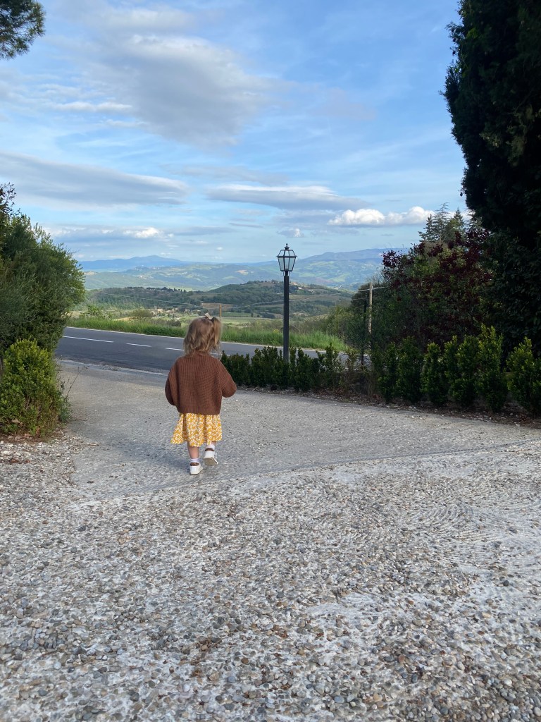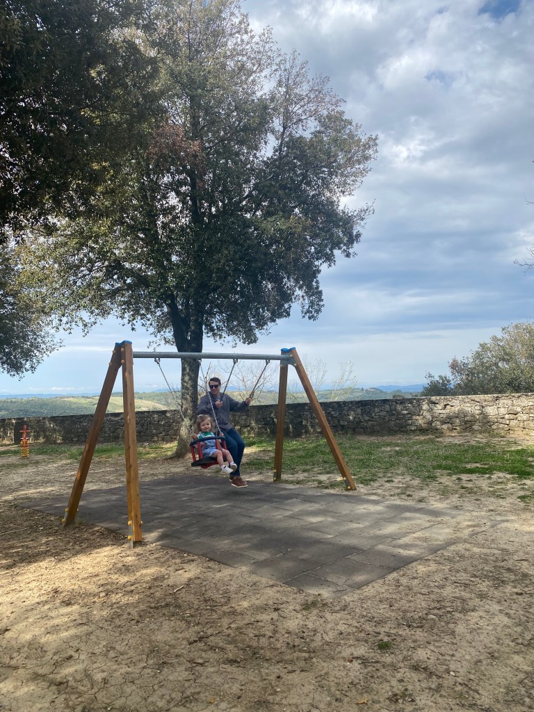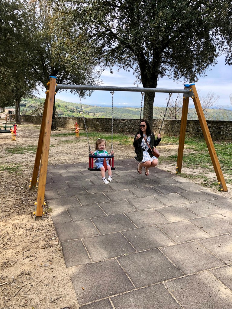 Right when you drive into the town there is a little public park area with walls built into the hill to sit on and enjoy the town’s view. There was a little hut set up right there selling wine, so we grabbed a half bottle and sat in the sun while Lucy climbed up and down the stairs. This is also the best spot in Montalcino to watch the sunset over Tuscany. (The photo at the top of this post was taken there.) We walked all through the town again and stopped at a pasticceria for some treats and shared them on a park bench before walking back up to the park for more swinging.