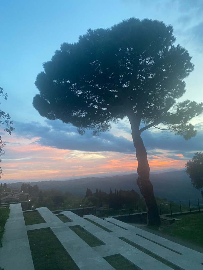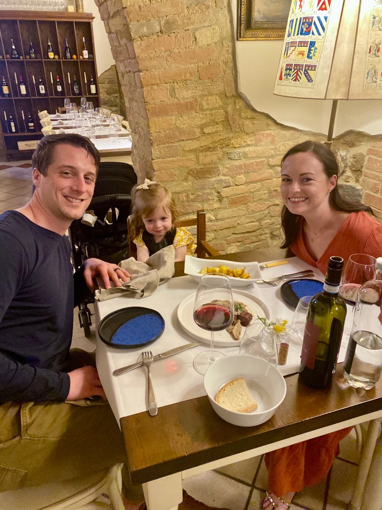 I was surprised to find the town was super quiet Friday night. It’s never been overly busy, but it was especially quiet this weekend. We walked around for a bit before heading to dinner at Il Grifo. We have walked by several times on past trips, but this was our first time eating there. We split a bottle of wine, pasta, and a very yummy steak, a MUST in Tuscany! Lucy was very happy with her pasta a bianco (buttered noodles as I called it growing up 😂). It’s always a safe choice for her and keeps her happy and busy through a dinner out.
