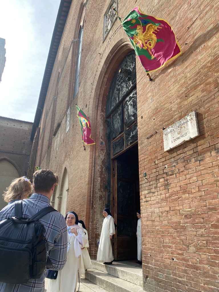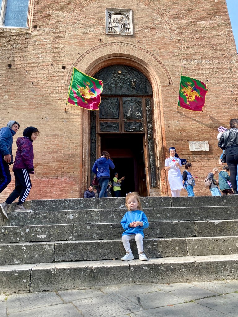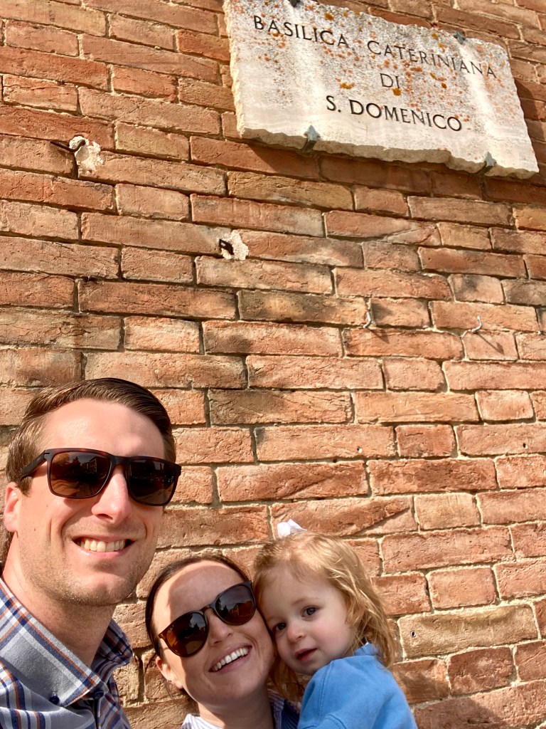 We parked near a really pretty panoramic lookout spot where you can see the Basilica and the Duomo di Siena. We visited the Basilica first, and as we walked up a group of nuns leaving came up to us smiling at Lucy and gave her a prayer card. You can’t take any pictures inside the Basilica, which I was really bummed about, but wanted to be respectful. You can look up photos online. Inside, there is a case that holds her thumb and then a separate chapel where you can see her head. It was really amazing to see. The altar in front of her chapel was covered in flowers people had brought for her Feast Day. Right when we got there, there was a large group of Red Cross Nuns. I’ve never seen them before, but it was so fun to watch them as they processed through the church to celebrate the Feast Day Mass. They wore the classic white nurse dresses with long navy blue habits.