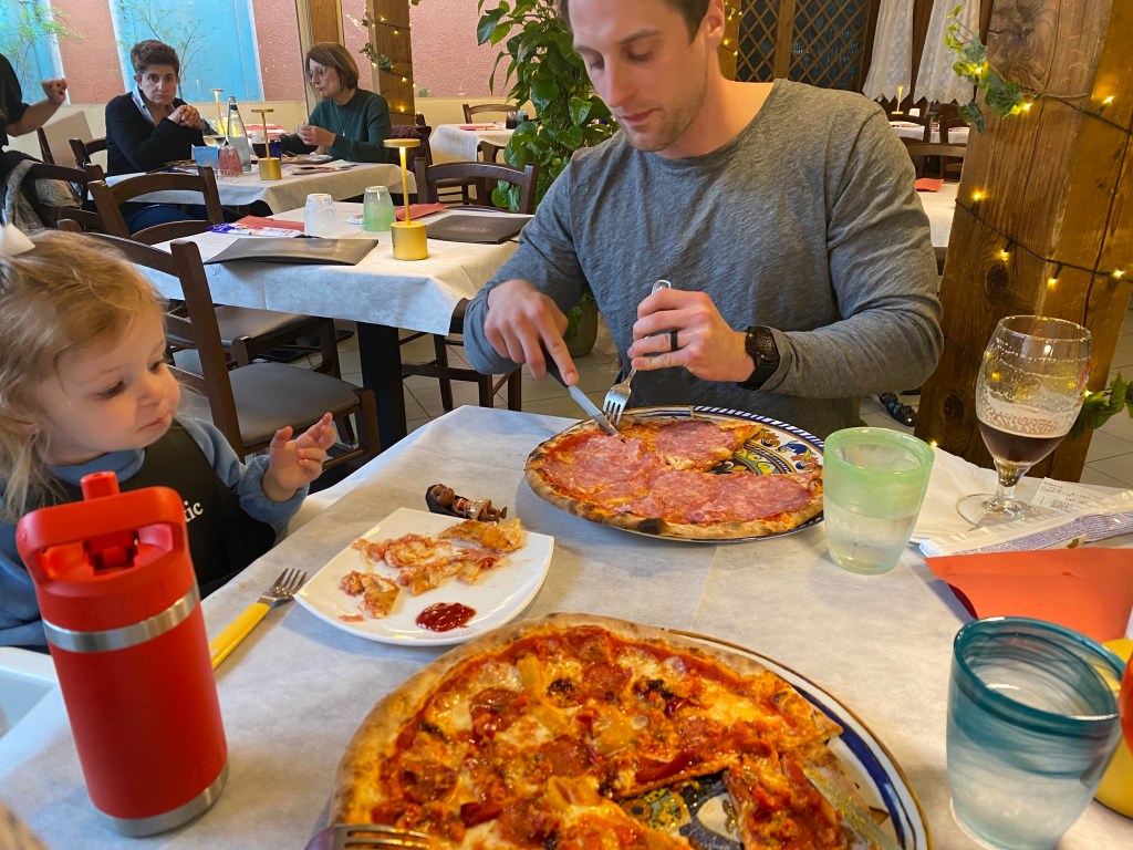 TiraTardi – One of my favorites in Vicenza. The menu is pretty extensive, which is unusual for traditional Italian restaurants, at least in our experience. But, that means they have something for everyone. It’s owned by an Italian couple, the woman is both hostess and waitress and her husband is the chef. They always make a great pasta a bianco for Lucy and they have really interesting, delicious desserts. Both Michael and I love their spaghetti aglio e olio with shrimp. It’s a super simple, spicy pasta, but something about it makes it probably my favorite dish in Vicenza. Great gnocchi and salmon, too! I love sitting on their patio when the weather is nice, as it sits in an alley just off Piazza Signori.