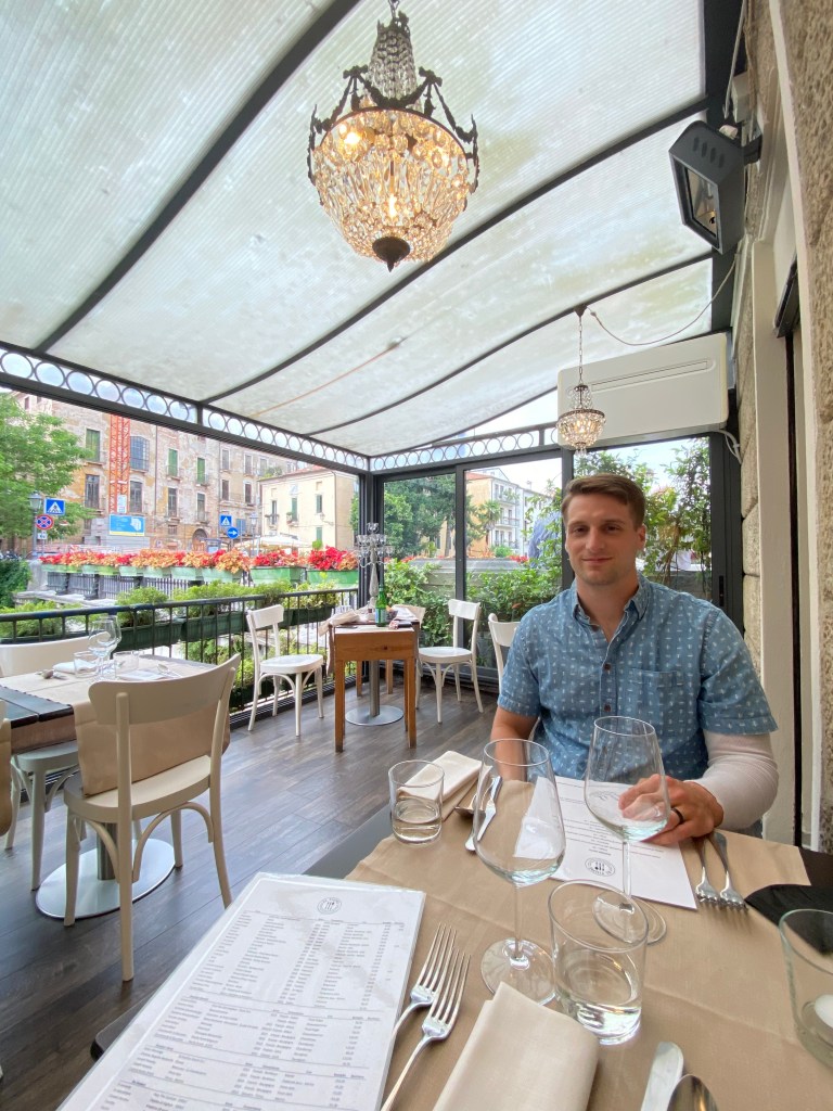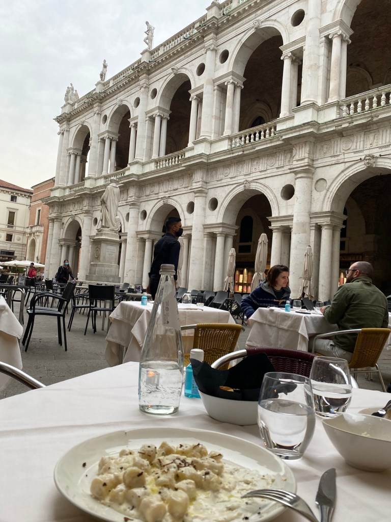 Angolo Palladio – Right in the center of the city, this is a really popular restaurant with lots of outdoor seating. We ate here the first night outdoor dining opened for dinner when restrictions started lifting in February 2021. Our first meal out in Vicenza and we plan to eat their the Sunday night before we fly out. Our favorite dishes are the black truffle gnocchi, bigoli with duck ragu, spicy linguine with prawns, tagliata steak, and the lamb chops. Ok, everything is delicious. Great pizzas, desserts, and wine list!